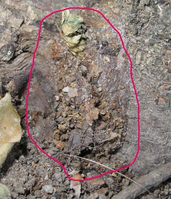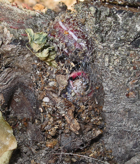 Tässä toukka aloitti koteloitumisen ja kehräämisen talvehtiakseen tässä