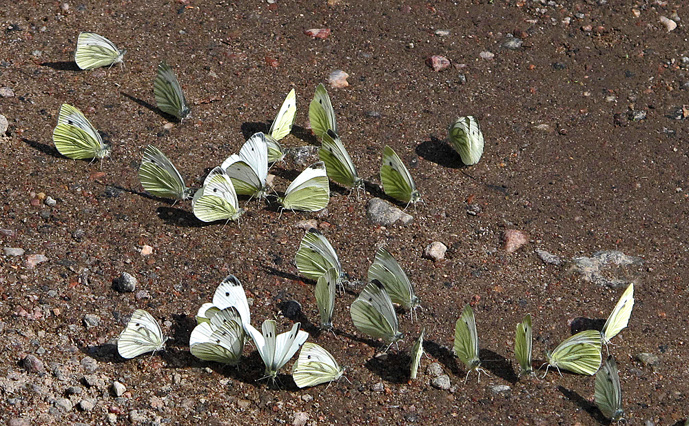 Kuvassa on 28 perhosta ja osa lenteli ympärillä. Kuva 16.8.2018 Lohjan Saukkolasta. Lahellä oli toinen samanlainen ryhmä.